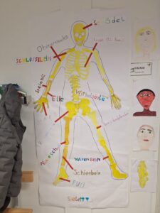 In den letzten Wochen beschäftigten wir uns intensiv mit dem Thema Körper. Dabei haben wir versucht in Lebensgröße die inneren Organe und unser Skelett zu zeichnen.